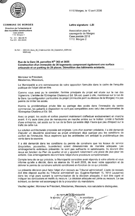 Notre opposition au projet de construction sur la parcelle Chatenoud (av. de la Gare 39) (21 décembre 2005)