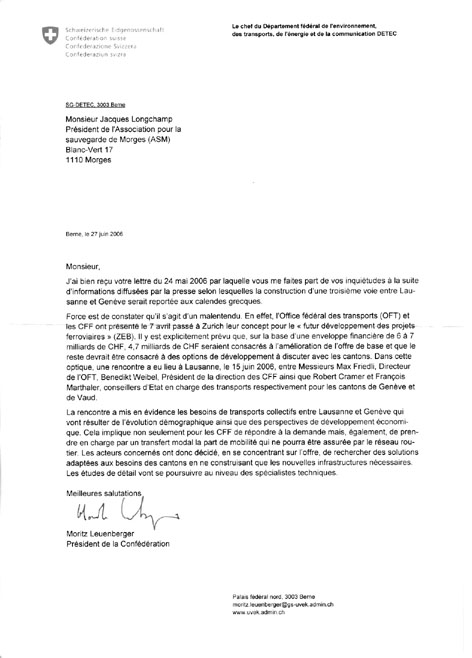 Notre lettre à M. Moritz Leuenberger, Président de la confédération (24 mai 2006). Nous lui demandons de revenir sur la décision de reporter la construction de la troisième voie ferroviaire qui doit permettre une desserte du type RER.